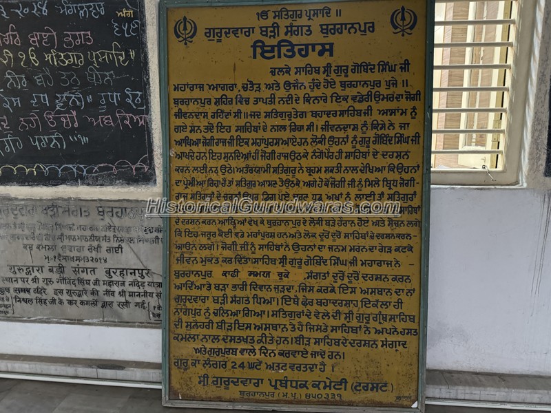 GURUDWARA SHRI BADI SANGAT PATSHAHI DASVIN SAHIB is situated in Burhanpur city of Madhya Pradesh. SHRI GURU GOBIND SINGH JI stopped here while moving towards Nanded. Along with GURU SAHIB was BadhShah Bahadur Shah. GURU SAHIB came here through Agra, Chittorhgarh and Ujjain. In those days a Old Sadhu Jeewan Das was living here on the bank of River Tapti. When SHRI GURU TEGBAHADUR SAHIB JI went to Assam, He was along with GURU SAHIB. When some one told him that a Mahapurakh named SHRI GURU GOBIND SINGH JI has come. Listening to the name he ran barefoot. When GURU SAHIB came to know that his disciple is coming, he also stood up from his seat. Jogi came and fell on the feet of GURU SAHIB. GURU SAHIB took him to the diwan. Sangat of Burhanpur was surprised to see this. They though he (GURU SAHIB) might be a Mahapurakh thats why people are coming for his darshans. GURU SAHIB set jogi free from cycle of life and death. GURU SAHIB stopped here for some long time. From here Badhshah went to Nagpur. And GURU SAHIB moved towards Nanded Sahib. Here an Old saroop of SHRI GURU GRANTH SAHIB JI is also preserved on which there is stamp of SHRI GURU GOBIND SINGH JI. Sangat can have darshan of Beed Sahib on Sangrand Day and on GURUPURAB DAYS.